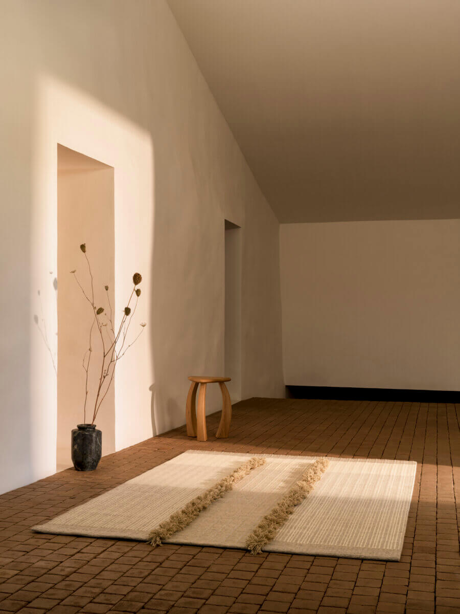For this collection, the portuguese rug brand did not begin with a concept. It began with a place. ALÉM TEJO comprises 13 rugs, each with its own cadence, relief, and pause. The foundation is undyed natural wool used in its raw state, minimally processed, renewable, and biodegradable. The tones were not selected; they are those offered by the material itself: whites, irregular beiges, soft greys. Across the collection, Ferreira de Sá draws on its full range of techniques, using tufting, hand-knotting, hand-weaving, and flatweave to give each design its identity through construction.