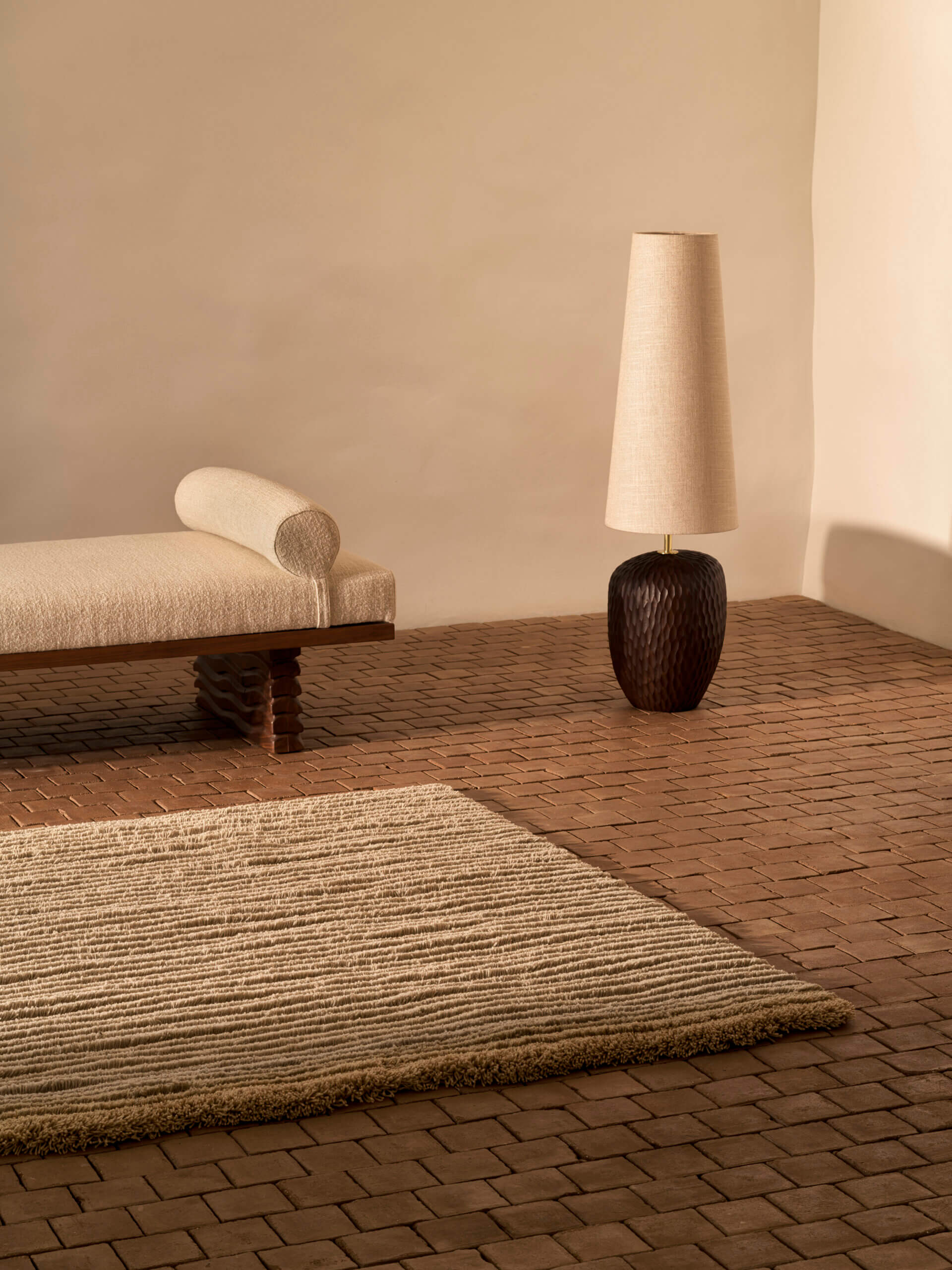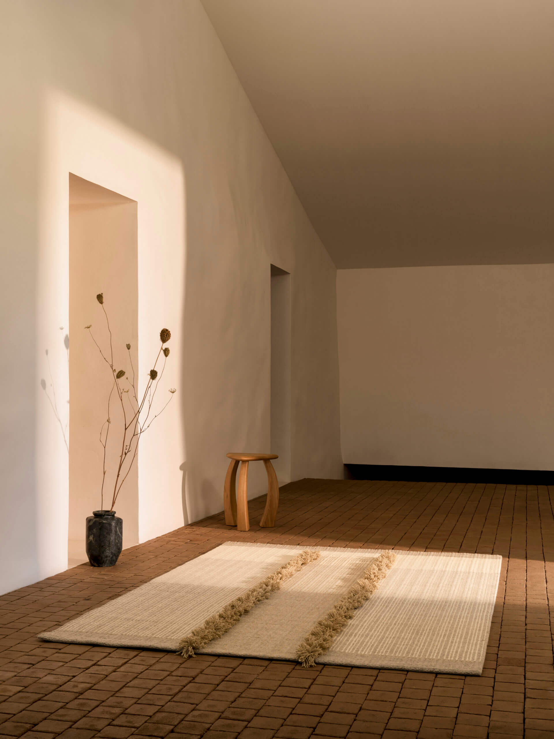 The ALÉM TEJO Collection clarified this position. Inspired by the Alentejo region in southern Portugal, the collection does not replicate landscape. It interprets it. Dry-stone walls become density. Limewashed façades become restraint. Cork bark becomes texture. Undyed natural wool becomes atmosphere.